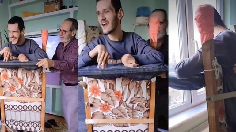 Baba Ramazan Sert’in hazırladığı aparatla oğlunu pencereden dışarıya baktırdığı görüntü, sosyal medyada çok sayıda hesaptan paylaşıldı, beğeni topladı.