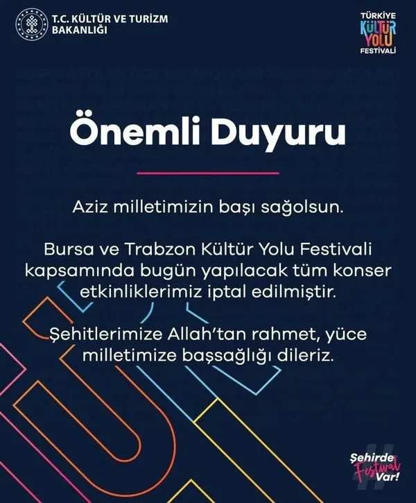 Milli Savunma Bakanlığı (MSB), Pençe-Kilit Harekat bölgesindeki bir mağarada yapılan arama- tarama faaliyeti sırasında metan gazına maruz kalan 19 askerden 5’inin şehit olduğunu duyurdu. Bu nedenle Kültür ve Turizm Bakanlığınca “Türkiye Kültür Yolu Festivalleri” kapsamında Trabzon ve Bursa’da düzenlenen festivallerde bu akşam planlanan konserler iptal edildi. Kültür ve Turizm Bakanlığından açıklama yapıldı. Açıklama da ” Aziz Milletimizin başı sağolsun. Bursa ve Trabzon Kültür Yolu Festivali kapsamında bugün yapılacak tüm konser etkinliklerimiz iptal edilmiştir. Şehitlerimize Allah’tan rahmet, yüce milletimize başsağlığı dileriz” ifadelerine yer verildi.